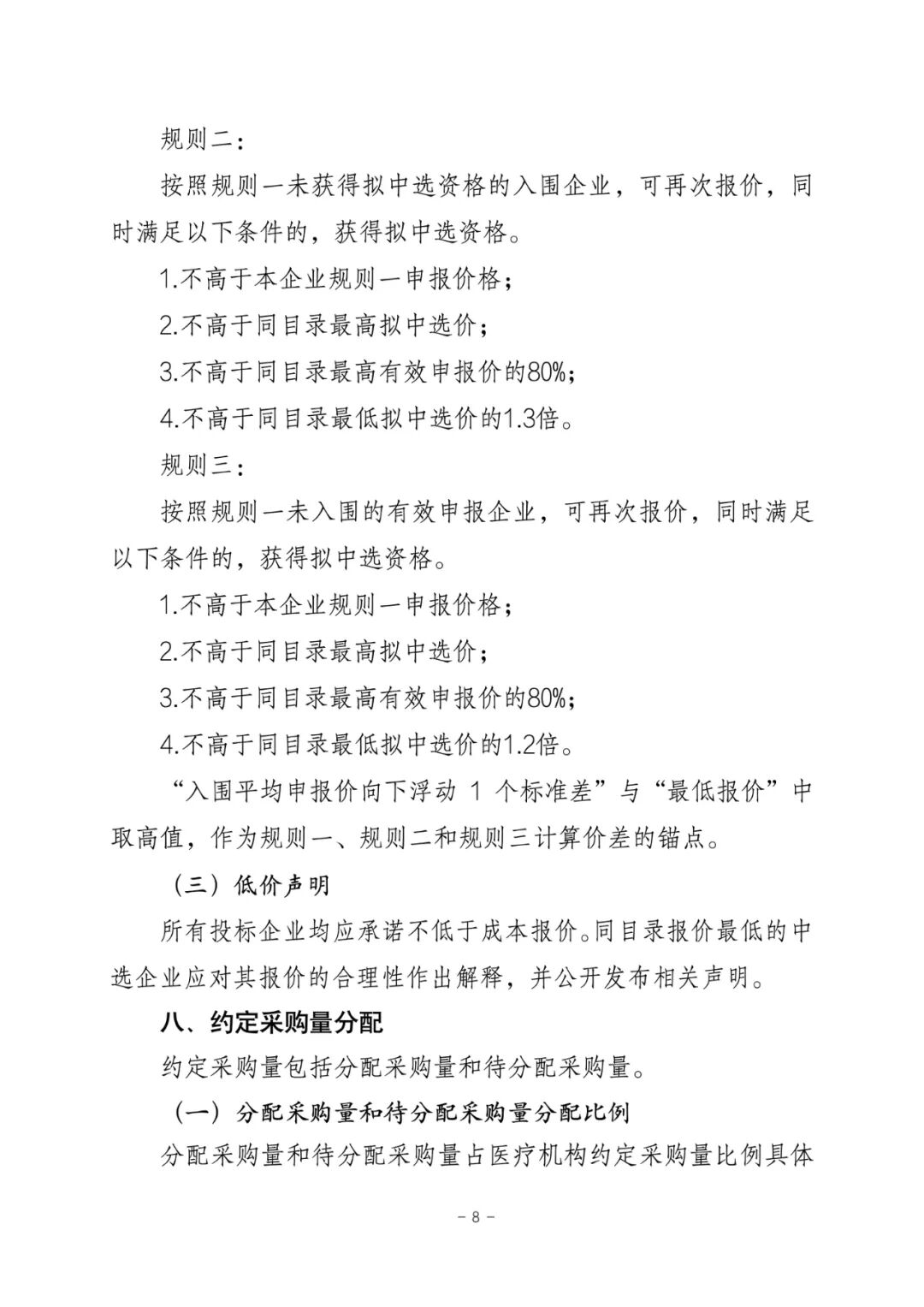 按照规则一未获得拟中选资格的入围企业,可再次报价。同时满足不高于本企业规则一申报价格、同目录最高拟中选价、同目录最高有效申报价的80%、同目录最低拟中选价的1.3倍这四个条件的,获得拟中选资格。