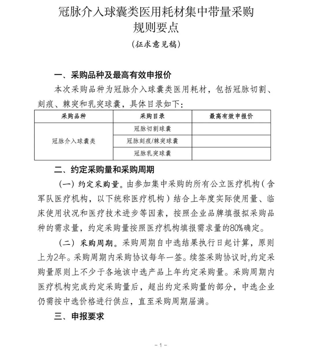 根据《意见稿》,此次采购品种为冠脉介入球囊类耗材,包括冠脉切割、刻痕、棘突和乳突球囊,最高有效申报价暂未公布。